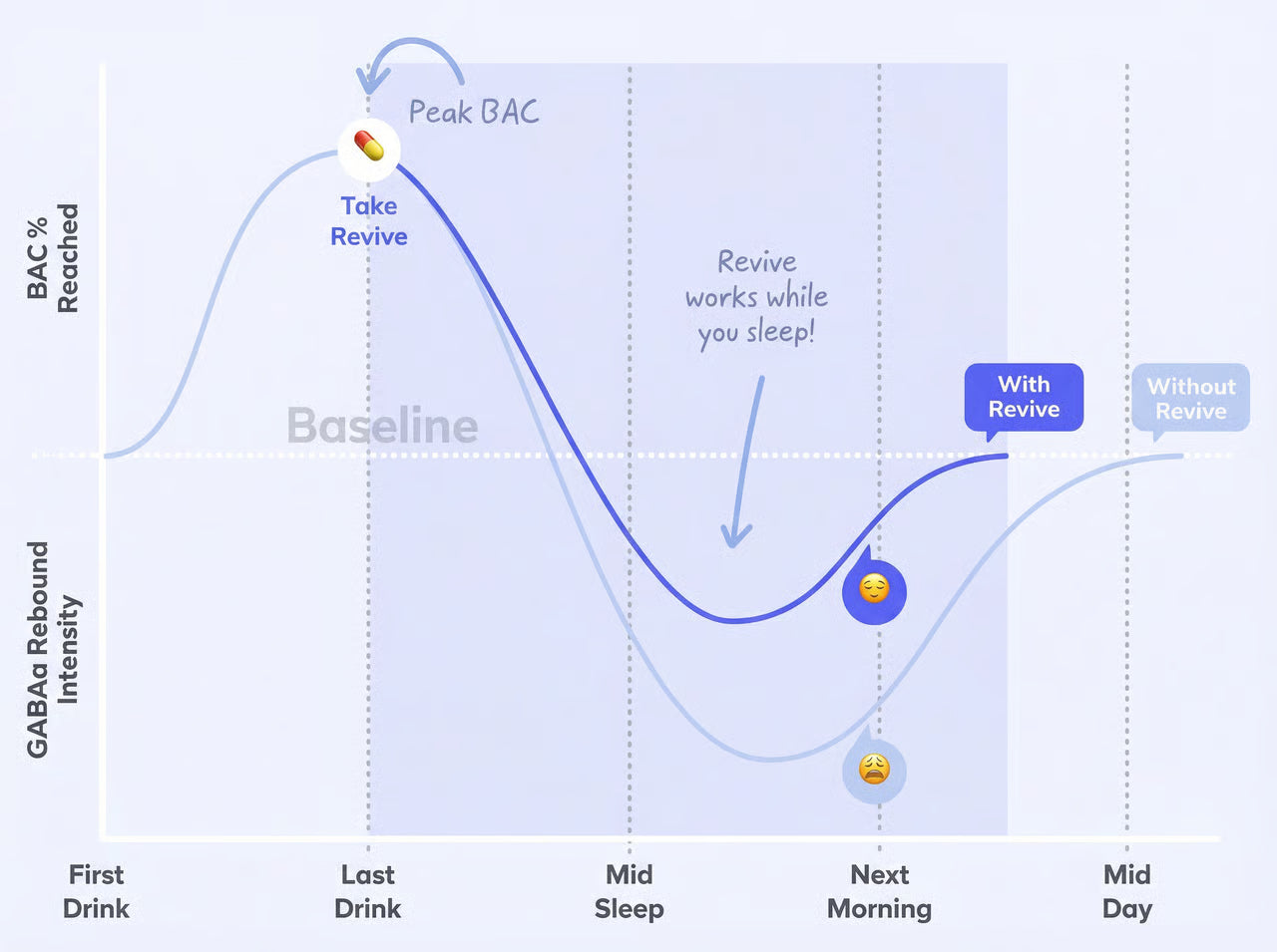 That next-day feeling of anxiety and irritability, or "hangxiety," is caused by alcohol's rebound effect on your brain chemistry. Revive's DHM works overnight to reduce this effect, helping you wake up feeling better.