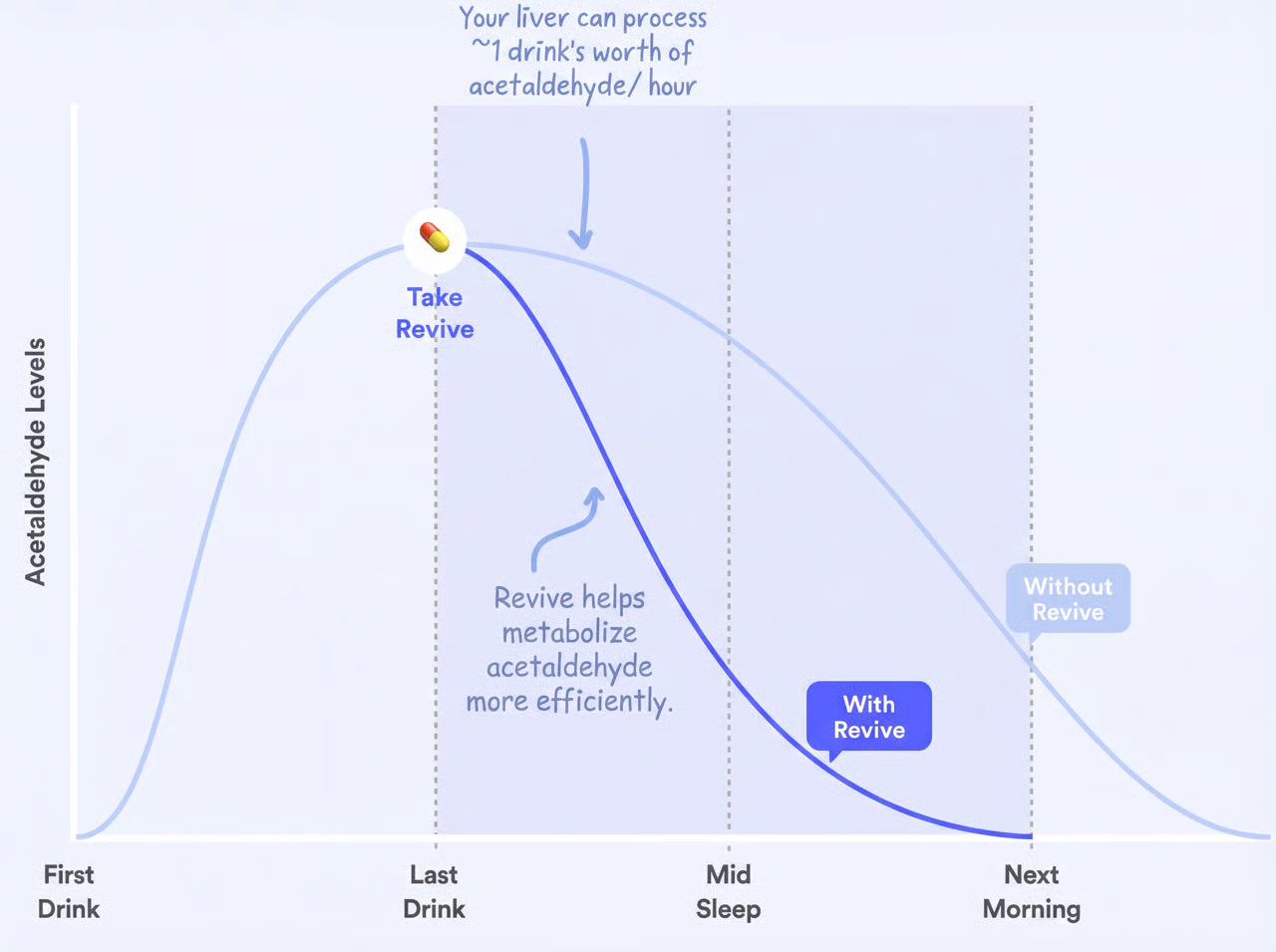 Revive's formula with DHM and cysteine helps you metabolize alcohol more efficiently. It works by reducing your body's exposure to toxic acetaldehyde, a byproduct of drinking, allowing you to recover faster.