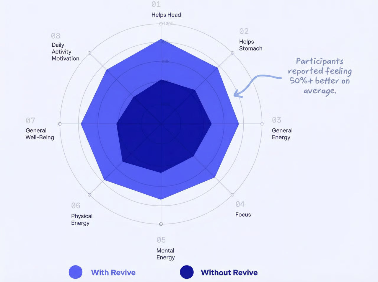 Conducted for our granted patent, participants in our human study felt an average of 50% better the next day across 8 typical effects after taking Revive. As a result, we guarantee that you’ll wake up feeling like you had half as many drinks —or your money back.